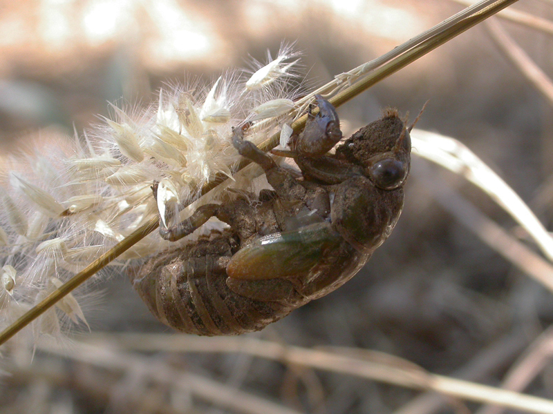 14h00 : l'enveloppe larvaire commence à se craqueler pour laisser sortir la cigale adulte.